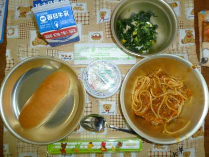 今日の献立は、「小型コッペパン・牛乳・スパゲティのミートソーズ煮・ほうれんそうのソティ・りんごゼリー」です。手を合わせて「いただきます!」みんな、おいしそうにいただいていました。