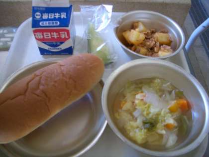 5月8日(水)の給食は,黒糖コッペパン,牛乳,豚肉のケチャプ煮,野菜のスープ煮,メロンでした。