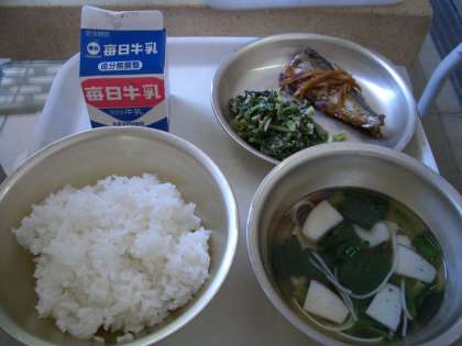 5月17日(金)の給食は,ごはん,牛乳,さんまのかわり煮,だいこん葉のごまいため,すまし汁でした。