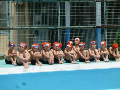 1年生は、はじめに水泳学習の約束事を徹底します。座り方や、水に入るときの合図の確認、友だちとの学習の仕方などなど。約束が守れないと、水には入れません。安全面からも、しっかりと指導します。子どもたちは、じっと先生の話に耳を傾けていました。