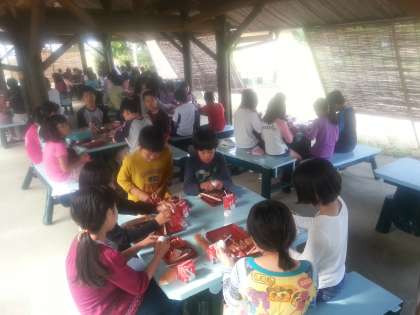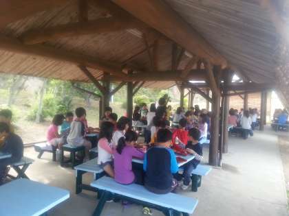 朝食風景です。朝から暑いのですが,午後から通り雨があるかもとのことです。心配です。