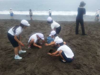 大野浜に着きました。波の音に歓声が響きます。砂で遊びました。山やトンネル、砂のケーキなどを作りました。砂浜のオブジェです。