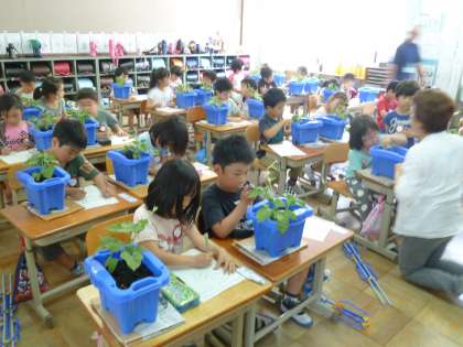 1年生ががんばってお世話しているアサガオ。本葉も出て大きくなってきました。観察記録をつけました。つるがどこへ伸びようか悩んでいるよう。いよいよつるが巻き始めますね。そこで、支柱を立てることに。これで、安心しておおきくなっていけるね。重い植木鉢をかかえて、並べに行きました。