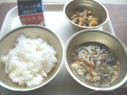 6月28日(金)の給食は,ごはん,牛乳,肉みそいため,もずくのスープでした。