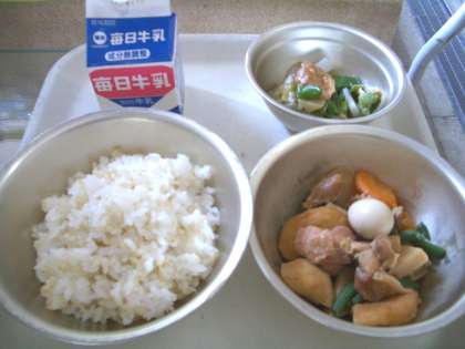 今日の献立は,胚芽米ごはん,牛乳,平天の煮つけ,京野菜のごまみそかけでした。