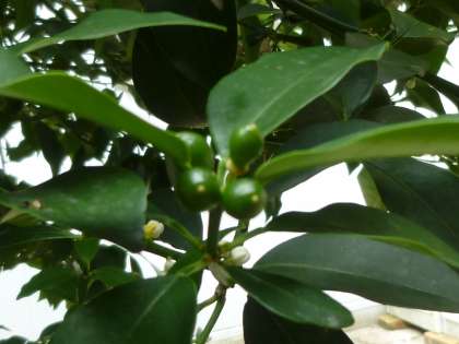 学校の中庭にあるきんかんの木ですが、今年はいっぱい実がなりました。初夏にオレンジのいい香りがする実。今も、オレンジの実はなっています。その中に、なんと次の実がもう来年においしそうな実になろうと枝先になっているのです。きんかんの小さな、可憐な白い花も咲いています。目をこらして見ないと、わからないぐらい小さい花です。暑い中でも、植物はちゃんと次の準備を始めているのですね。
