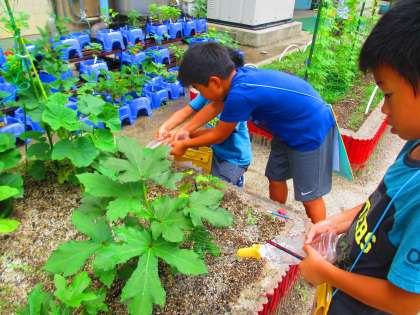 学年園で,おくら・きゅうり・なすびを育てています。朝や放課後には水やりをしたり草ひきを自主的にしてくれている子どももいます。毎日少しずつ成長する姿が楽しみのようです。生活科の時間には,先週と比べて変わったことを見つけたり,来週にはどんな姿に成長していくのか想像をしたりしています。