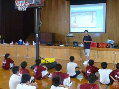 体育館ではバスケット部がビデオを使って練習。理論も学んでいるのですね。