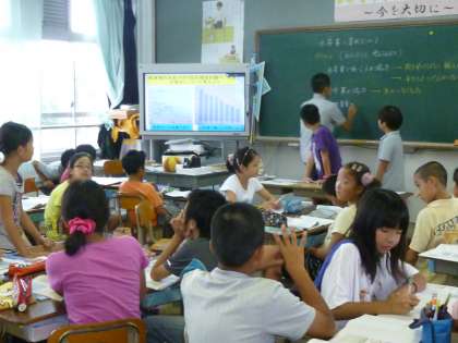 5年生は社会科の学習。水産業の変化について、グラフ資料から読み取り、推論してグループで話し合っていました。社会では、よくグループ学習を取り入れているとのこと。一人一人が課題意識をもって、学習にのぞむように工夫されています。