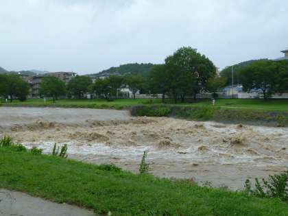 鴨川も水かさがずいぶん減ってきました。でも、絶対に子どもたちは近づくことがないようにしてください。普段の鴨川とは全く違って、危険です!(写真は9時半ごろの撮影です。)