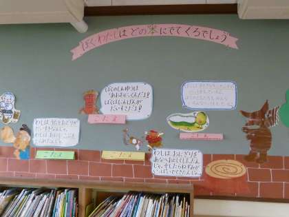 図書館の掲示物も工夫しているところです。物語に登場する主人公を考えるコーナーを作成してもらいました。みんな、名前がいえるかな?