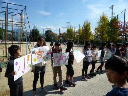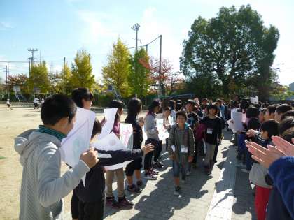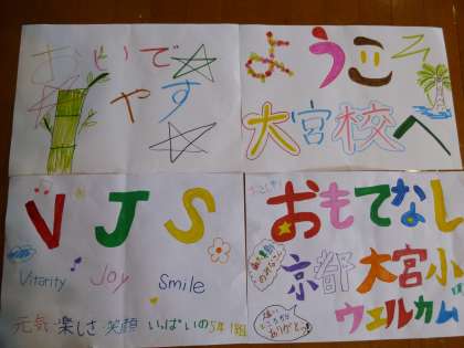 5年生は正門でお出迎え。「ようこそ!大宮小学校へ」と書いたカードを掲げ、拍手とハイタッチでお迎え。照れながらもとっても嬉しそうな南大東小のみんなです。