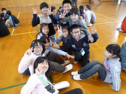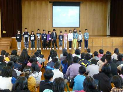 その後は、仲良くなることをねらいにゲームを楽しみました。あっというまに、みんな打ち解け、肩を組んでいる子どもたちや、名前で呼び合う子どもたち。子どもってすごいですねえ。感心しました。そして、5年生の子どもたちのそんな姿をうれしく、頼もしく思いました。京都と南大東島、距離はすごく離れているけれど、子どもにかかったら、心の距離はすぐになくなるのですね。
