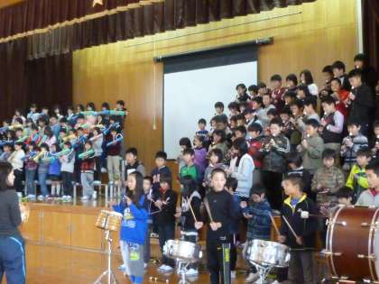 体育館から、子どもたちが学習発表会に向けて練習している様子が伝わってきます。音楽の演奏の音や、元気いっぱいなセリフを言う声など。どの学年学級もがんばっています。今日は、朝から6年生、続いて5年生の練習がありました。