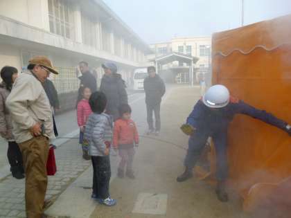 煙ハウスを体験。よいお天気の中なので、比較的明るいのですが、それでも煙が発生していると、すぐ前にいるはずの人が見えません。消防署のかたにお聞きすると、「実際は煙は黒く、何しろ熱いです。しかも夜だと真っ暗で全く見えません。腰をかがめ、低い姿勢で、できたら口を押さえるハンカチは濡らしてある方がいいです」と教えてくださいました。