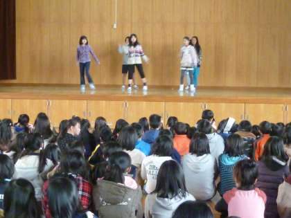 今日の中間休みに、体育館でダンス・バトンクラブの発表会が行われました。1年生から6年生まで多くの子どもたちが見に来てくれました。