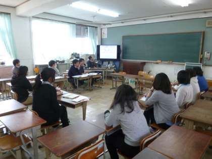 修了式の日、遊びに来ていた子どもたちも下校した放課後、若手の先生たちが自主的な勉強会を開いていました。授業のはじめに、どのような工夫をしたら、子どもたちは興味をもって学習にのぞめるかと、これまでの授業を振り返りながら、「こんな方法で授業をしたら、子どもたちが意欲的でしたよ」など、話し合っていました。