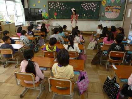 1年生の教室での様子です。休み時間がいつなのか気になっている子ども、そして、友だちができたことを嬉しそうに報告してくれる子ども。なんだか楽しそう。