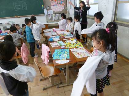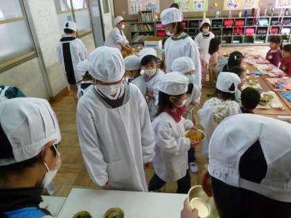 先生が、「今から給食の用意をするよ」と言われると、1年生から「給食を作るの?」「どこで作るの?」という声が。1年生の教室をのぞくと、おもしろい場面がいっぱい見られます。
