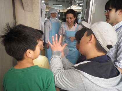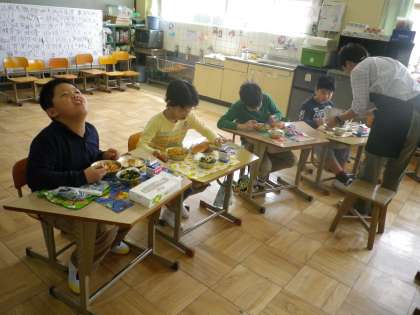給食室に行き,栄養教諭さんや調理員さんにあいさつをしました。新しく来た調理員さんにも覚えて頂きました。そして,新学期が始まって最初の給食を食べました。とってもおいしくて,みんなにこにこ笑顔で食べていました。