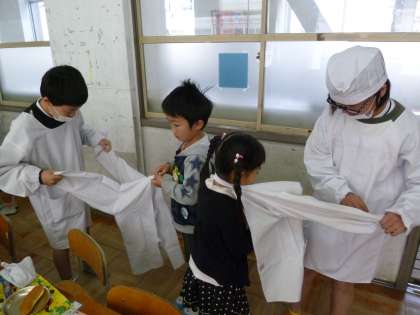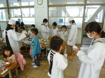 給食時間にも、6年生が活躍してくれました。給食の用意を手伝ってくれたり、教えてくれたりと、てきぱき。頼もしいお兄さん、お姉さんだね。1年生にとって、6年生はあこがれの先輩なのですよ。