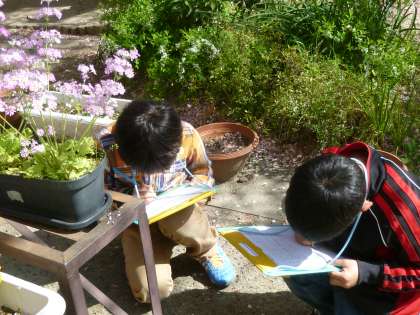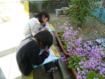 暖かな春の風を受けて、外での学習はとてもいい気持ちです。春の草花をじっくり観察して、スケッチしていました。気づいたこともカードに書き込んでいました。