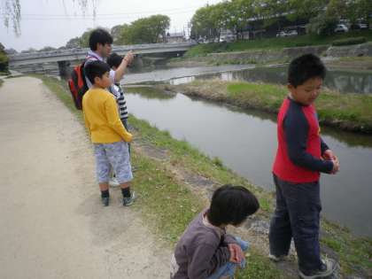 今日はおもしろいものやかわいいもの,不思議なものを探しに賀茂川へ行きました。大きな鳥に驚いたり,木の芽を見つけたりと楽しそうに活動していました。