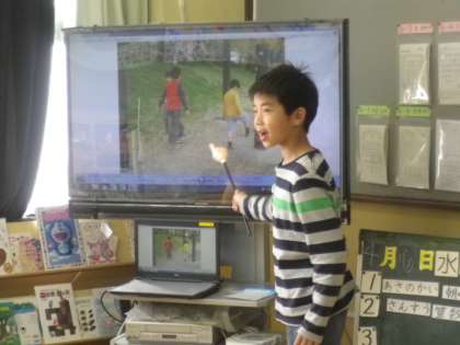 学校に帰ると,見つけたものの写真を見ながらみんなの前で話をしました。「タンポポの綿毛がありました。」「エンドウの花がかわいかったです。」など,上手に話ができました。