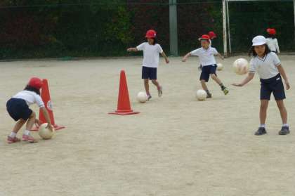 サッカーボールを上に投げてキャッチしたり,ドリブルをしたりしました。