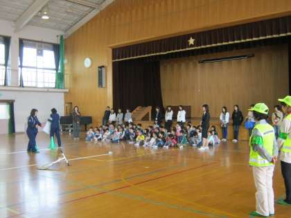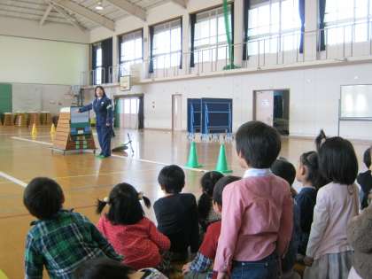 2時間目の参観では、1,2組が安全教室を体育館で2クラス合同に行いました、北警察署からも来ていただき、横断歩道のわたり方や、道路での歩行の仕方、車に気を付けて交差点の進み方などを学ぶことができました。