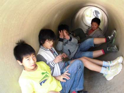 スイカマンが梅原先生に変身する間、小学校の遊具で遊びました。そらいろ学級のみんなは、本当になかがいいね!