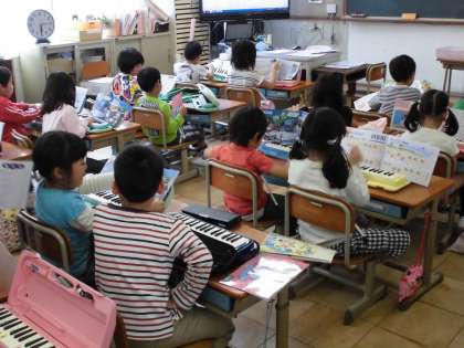 1年生の教室から、鍵盤ハーモニカの音が聞こえてきます。入学して、はやひと月。音楽の時間には、もう鍵盤ハーモニカを使っての授業を始めています。