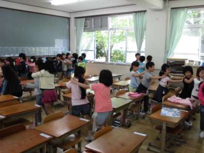 隣のクラスでは、「かもつれっしゃ」です。列車になって、ごつんこしたらジャンケン。机の間を通りながら、音楽をよく聞きながら楽しむ様子が見られました。