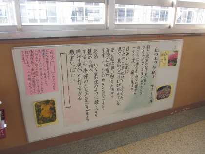 学年の国語コーナーは、「丘の上の学校で」の詩を掲示しています。最後の一文を四角で抜き、子どもたちに自由に想像してもらいました。出来上がった一文は、ポストに投函できるようになっていて、優秀作品はもう片方の国語コーナーで毎週発表しています。多い子は、5つ、6つと投函しています。すてきな一文がたくさんあり、優秀作品を選ぶのも大変なくらいです。毎週の発表を楽しみにしていてくださいね。