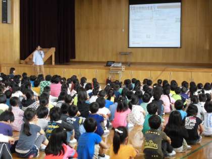 次に、生徒指導から、大宮校のきまりについて話がありました。何のために「きまりごと」があるのかな?先生からそんな話も踏まえて、「あいさつ・そうじ・スリッパ」という言葉を実行できるようにと話がありましたね。いい笑顔になれるよう、みんなでがんばりましょう。