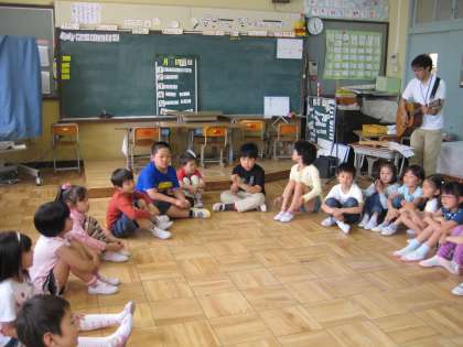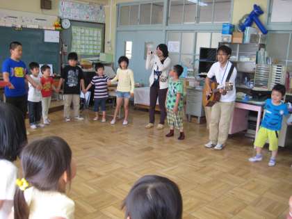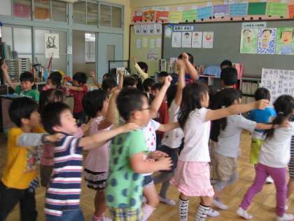 1組がそろいろ学級の4人のお兄さん・お姉さんと交流しました。名前を覚えた後、握手ゲームをしたり、じゃんけん汽車ゲームをしたり、歌を歌ったりと、楽しいひと時を過ごしました。