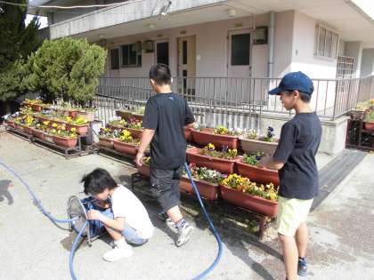 そらいろのみんなは、朝、正門の花壇に水やりをしてくれます。