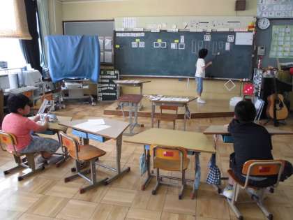 授業の様子も見に行きました。国語の文づくりをしています。気に入った漢字カードを2枚選び、文を作っていました。自由に作るのではなく、ちょっぴり条件がつけられます。その条件をふまえての文づくりです。よくできていましたね。