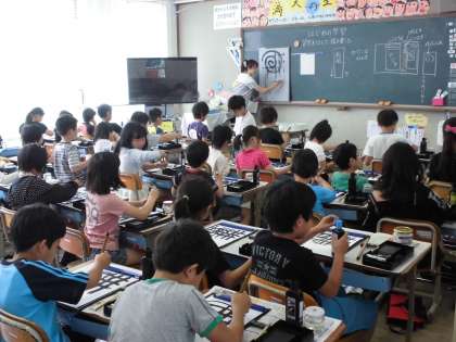 3年生の教室では、書写の時間で毛筆です。くるくると円を筆でえがいていました。筆づかいの学習ですね。墨をこぼすと大変。準備や後始末もしっかりやろうね。