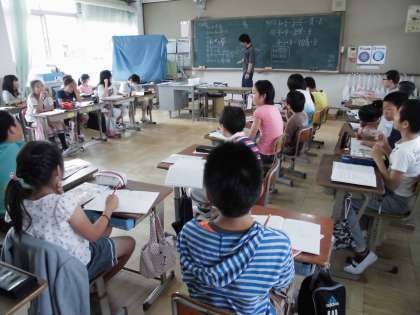 最後は6年生の授業です。どのクラスも教室にはいなくて、特別教室に行っているようでした。1組が算数をしています。分数×分数の計算。帯分数があると難しいね。