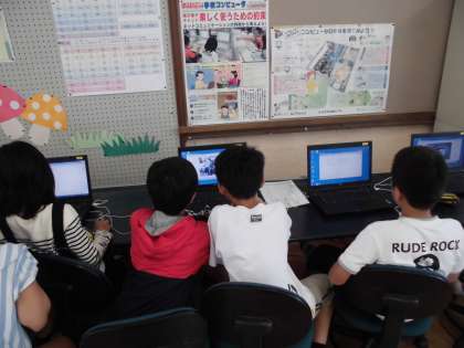 コンピュータールームに子どもたちがいました。修学旅行での写真を見て、修学旅行のプレゼンを作って発表し合う学習に取り組むそうです。