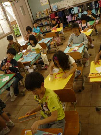 クレヨンを持って大きな画用紙に向かい,描いている姿がとっても可愛い1年生です。