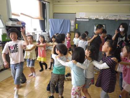 そして,みんなで「なかよしれっしゃ」をしたり,「しあわせなら手をたたこう」を歌ったりしました。そらいろの子どもたちも1年生たちもとっても楽しそうに活動していました。