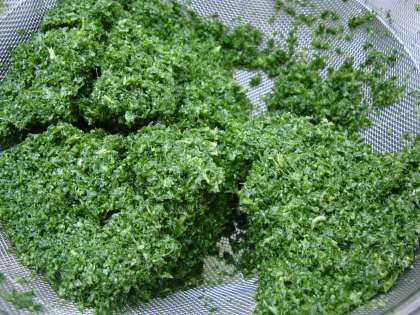 さわらの香草あげは,生のパセリを使います。パセリの葉はみじん切りにし,パセリの軸は,野菜のスープ煮を煮込む時にローリエと一緒に入れて使います。