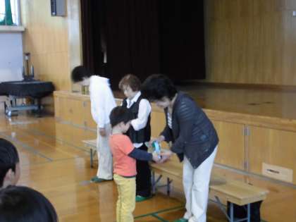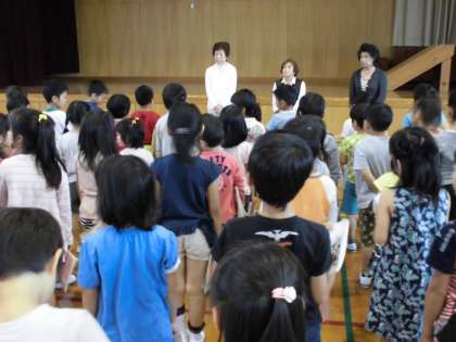 今日の2時間目、体育館では、やまなみボランティア会の方に来ていただき、地域の高齢の方へのプレゼント「あさがお」をお渡ししました。1年生のみんなが種をうえて芽が出てきた朝顔です。美しい朝顔が咲くといいなあと願っています。