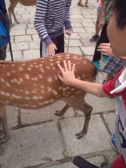 あいにくの雨のため,バスの中で弁当を食べ,東大寺へ行きました。鹿がたくさんいたので子どもたちは鹿を避けながら東大寺へたどり着き,大仏を見たり,柱の穴をくぐったりしました。帰り道は,ほかの6年生の子どもたちが鹿をさわっているのを見て影響されて,鹿をタッチすることができました。