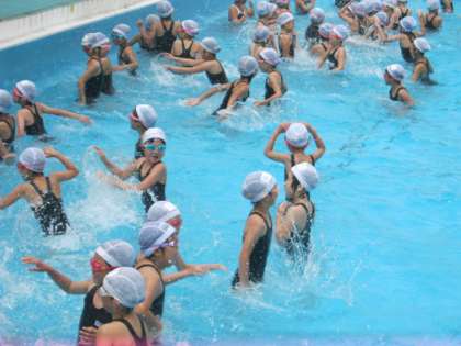 教室で着替え,シャワーを浴び。準備体操をして・・・・