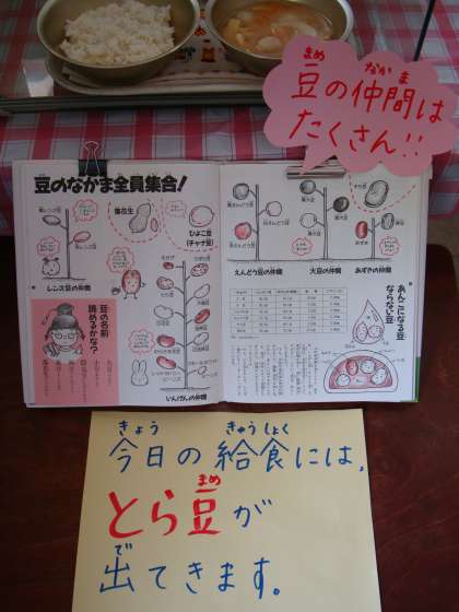 とら豆は食べたことがなく,苦手な人も多かったですね。これからも,給食にはいろいろな食品が登場します。楽しみにしていて下さいね。