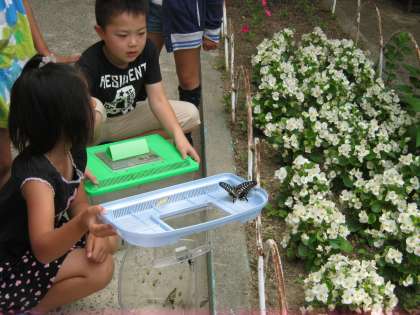 中間休みに中庭で飼育ケースのふたを開けると,元気いっぱいに飛び出していきました。その中の一匹が子どもの腕にとまり,別れをおしんでいるかのようでした。