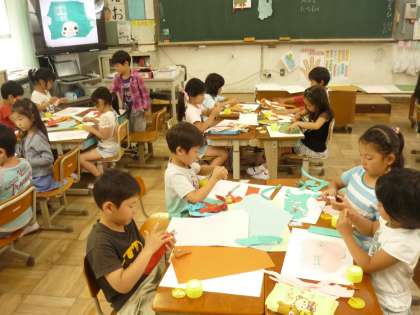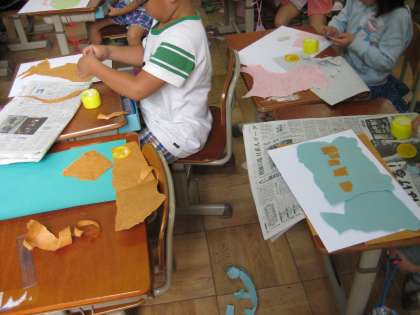 図画工作科の学習をしました。好きな紙を選び、手でちぎります。できた形をくるくる回して、何に見えるか考えました。バス・うさぎ・くじらなどできた形から想像を膨らませて、さらに、色画用紙をちぎったり、切ったりして貼りました。